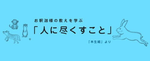 森の中に、ウサギとサルとオオカミとカワウソが住んでいました。この中でウサギには智慧があり、常々、他の3匹に対し、他に施すことの大切さを説いて教えていました。